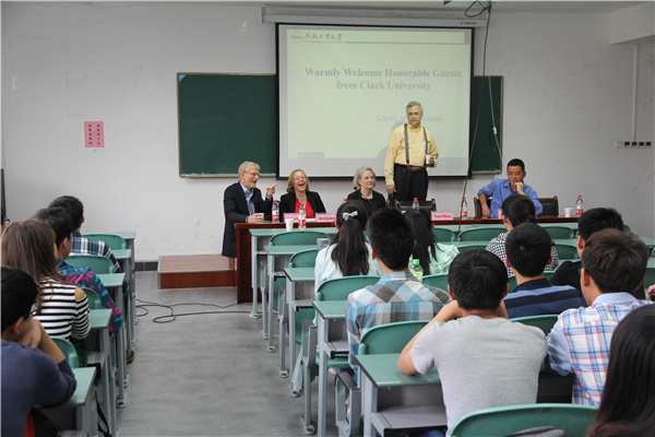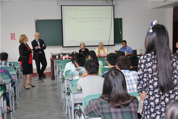 下午两点半,克拉克大学代表团与威廉希尔官网学生在建筑艺术馆118教室举行了见面会,由郑园琴老师主持。参加此次见面会的学生主要为威廉希尔官网国际经济与贸易专业(中外合作办学)15级学生以及有意前往克拉克大学深造的13级、12级本科生和研究生,国贸系党支部书记谢众也参加了此次见面会。见面会开始,克拉克大学代表们首先向学生们进行了幽默风趣的自我介绍,博得了在场学生的阵阵掌声。在接下来的学生提问环节,学生们围绕克拉克大学的课堂文化、住宿环境、饮食状况、“3+1+1”项目的具体选拔标准与要求、在美国留学的优势条件以及硕士项目介绍等方面踊跃提问,克拉克大学代表们一一进行详细回答,并且准备了许多精美礼品奖励所有提问的同学。此次见面会交流热烈欢快,氛围轻松愉悦。
