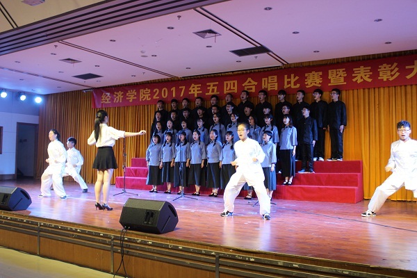 合唱比赛分必唱曲目《光荣啊,中国共青团》和自选曲目两个环节。经济学15-1班《精忠报国》用歌声歌颂爱国情怀,同学们的歌声激情昂扬,响彻整个大厅,武术表演刚劲有力,令人振奋,引来了阵阵掌声。随后,经济学16-1班带来《仰望星空》,中外国贸16-3班合唱歌曲《国家》,财政学15-1班表演了《最初的梦想》……九个班级先后上场,激情昂扬的共青团团歌9次在赛场响起。各班的自选歌曲有的表现了同学们对家国的热爱之情,有的表达了同学们对美好生活的向往和珍惜,还有的传递出同学们对青春时光的留恋与思考。比赛形式丰富多样,各班级采用武术、朗诵、手语、舞蹈、乐器演奏等形式配合合唱,充分展现了同学们的多才多艺与大胆创新的精神。最后,经过评审,中外国贸16-2班合唱表演的歌曲《倔强》,以新颖的表现形式、热情投入的表演和演唱赢得了观众的认可,获得合唱比赛一等奖,中外国贸16-2班、中外国贸16-3班获得优秀组织奖。