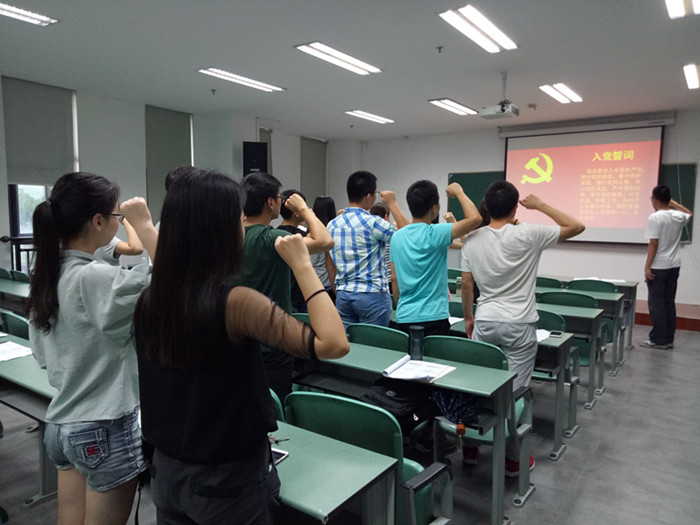 在活动开始,全体党员面对鲜艳的党旗庄严宣誓:“我志愿加入中国共产党,拥护党的纲领,遵守党的章程,履行党员义务,执行党的决定……”每一句誓言的宣读,都震撼着每位党员的心灵,使每名党员的思想与精神再次得到了洗礼和升华。随后,党支部副书记杨嘉祥发言,他提出:作为一名学生党员,要努力提高政治理论水平和党性修养,要将习近平总书记系列重要讲话学深悟透,自觉运用其立场观点方法观察问题、分析问题、解决问题,始终以“三严三实”标准严格要求自己,做忠诚、干净、担当的党员。最后,支部党员讨论并分享了他们的入党动机或者入党经历,希望以此让所有党员不忘入党初心,继续前进。