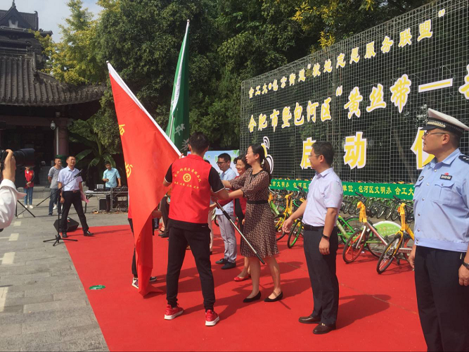 上午10时,合肥市包河区文明办宣读《包河区“黄丝带•共享单车文明行”志愿服务活动行动方案》标志了活动的正式开始。随后,来自合工大的志愿者代表宣读志愿服务活动倡议书,文章批判了人们在骑行过程中无序摆放、无序养护、无序管理等问题,倡议全市人民文明骑行,共建和谐社会。紧接着,社区居民代表宣读致居民的一封信并由ofo、摩拜、酷骑、享骑四家单车城市经理发布《合肥市共享单车企业自律公约》,此公约传达出四家共享单车企业对加强单车的有序管理有了一个共同的目标,表达了他们共建文明社会的集体意愿。志愿者们全程认真聆听,积极响应领导们和代表们的号召。宣读完毕后,各嘉宾领导为共享单车绑扎此次活动的标志黄丝带。最后,“斛兵青年帮客联盟”、“黄丝带志愿服务队”授旗并出征,两种队旗交相呼应,一起向文明进发!