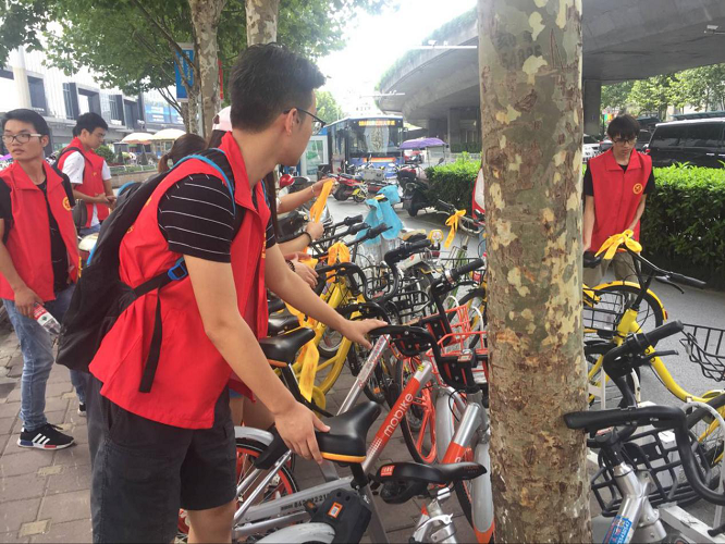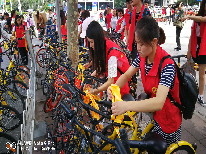 经院的志愿者们随后来到了万达广场门口,将此区域内乱停乱放的共享单车都一一整理、摆放到规定的停车地点,并系上黄丝带,有部分同学友好地向正在使用共享单车的群众提醒单车的停放规则。回到学校之后,经院的志愿者们下车后继续贯彻活动精神,随即把停放在校门口的共享单车进行了一次小范围的整理。同学们用实际行动表明,文明骑行的观念已深入其中。