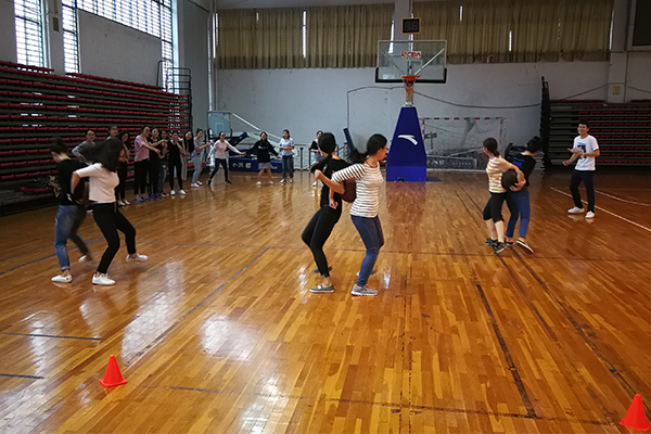 天旋神射手,六人一组,三男三女,每个人转圈之后投篮,男生站罚球线,女生可随意选择位置。由于加入了转圈项目,那些平时打球比较好的同学也有几位发挥失常,有的队伍前半程领先,后面却被反超,比赛结果充满悬念,不到最后一刻是无法决出冠军的。每当有同学投出高质量的球,都会赢得观众的阵阵掌声。