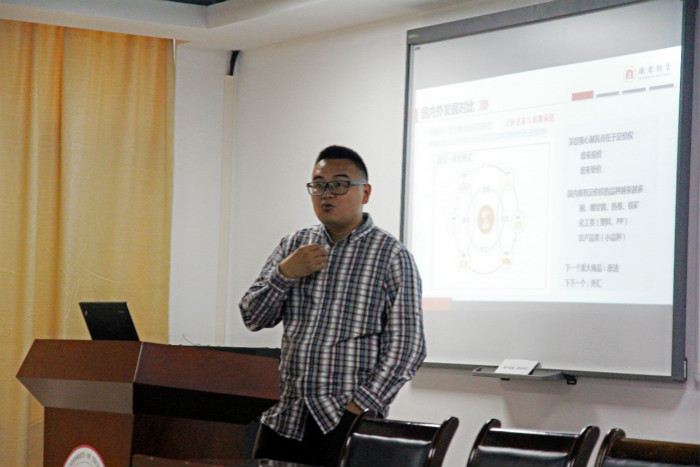 随后,来自徽商期货的人力资源部负责人潘胡平以及研究所总经理张宝平分别上台介绍徽商期货的公司现状以及招聘计划。他们通过宣传片和业务介绍的方式详细介绍了徽商期货的主要业务以及在行业内的地位,并进一步介绍了此次招聘实习生的三个岗位及其主要工作内容。张宝平总经理殷切地期待各位同学的加盟,在座同学反响热烈,纷纷留下自己的联系方式和信息。