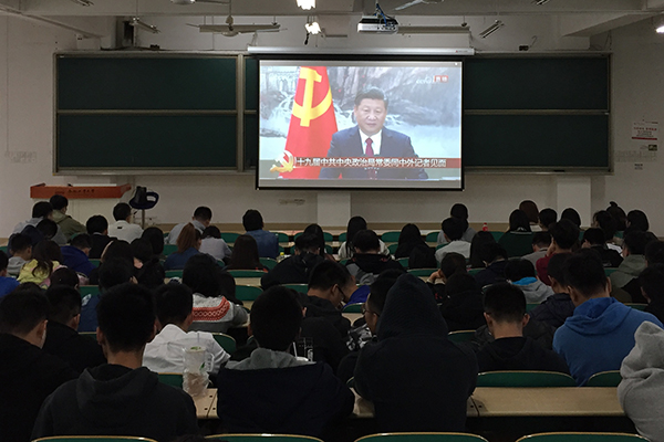 10月25日上午11时45分许,第十九届中共中央政治局常委同中外记者见面会在人民大会堂东大厅举行。英国威廉希尔唯一官网组织师生集中收听收看见面会直播。在翡翠湖校区科教楼东楼1208会议室、3教102教室,学院领导班子成员、各系和机关党员干部、教职员工及本科生近三**集中收看了见面会。