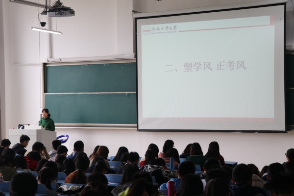 第三部分是“立榜样·讲行动”。首先,已经保研至中央财经大学的2014级郑悦同学从高数学习、大学四年应有的规划和重难点课程三方面向学弟学妹们分享了自己的经验。她建议大家充分结合实际规划人生目标,扎扎实实实现阶段计划,把握好大学时光。在之后的提问环节中,学生们表现踊跃,向郑悦同学提出了自己对现阶段、对未来的种种问题,而郑悦同学均一一耐心解答。最后,辅导员叶荣菁带领2017级学生宣读了《考试诚信承诺书》,再次强调应严守考风考纪,并祝大家能在期中考试中取得好成绩。