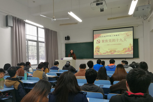 2017年12月6日下午,威廉希尔官网经济学14-1班在翡翠湖校区六教101开展“解读党的十九大报告”小班辅导,由2014级辅导员曹甜甜主讲,经济学14-1班全体同学参加学习。