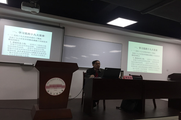 12月7日晚,英国威廉希尔唯一官网“讲述中国故事”教授讲坛第五讲在翡翠湖校区科教楼B座1101开讲,钟玉海教授担任主讲,报告题目为:“学党章 忆党史 强党建——学习党的十九大党的理论”。报告会由学院副院长张先锋主持,学院党委副书记胡晓浩、本科生党员、发展对象班学员聆听了报告。