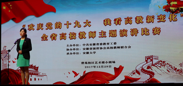 为深入学习宣传贯彻党的十九大精神,讴歌党的十八大以来安徽高等教育的巨大变化和发展成就,全面展示我省高校贯彻落实全国全省高校思想政治工作会议精神,落实立德树人根本任务的生动实践,进一步激发我省高校教育工作者忠诚党的教育事业,爱岗敬业、乐于奉献,践行“四个统一”要求,为五大发展美好安徽建设不懈奋斗,共同谱写中华民族伟大复兴中国梦的安徽篇章。中共安徽省委教育工委在全省高校范围内举办“欢庆党的十九大,我看高教新变化”主题演讲比赛。