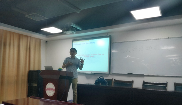 在讲座中,张岭松副教授首先通过数个生动有趣的例子给大家介绍了尺度空间理论,阐述了“尺度”对于解决图像识别和视觉问题的重要性。接着,张岭松副教授针对图像处理过程出现的异常值干扰,受互联网异常检测和空间聚类检测方法的启发提出了一种多分辨率异常检测方法。该方法同样适用于长记忆性时间序列数据变结构分析、面板数据变结构处理和空间区域数据聚类分析。最后,张岭松副教授通过模拟和实例展示了该种异常检测方法在应用中的优越性和有效性。在讲座互动环节,威廉希尔官网师生就这种异常检测方法的应用范围和尺度空间理论的应用等方面进行了提问,张岭松副教授一一进行了详细的解答。张岭松副教授的讲座深入浅出,图文并茂,为威廉希尔官网师生开阔了研究视角和方法,极大激励了威廉希尔官网师生的研究兴趣与热情。