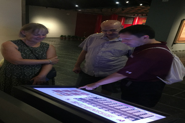在安徽名人馆,讲解员带领外教们以时间为序列,依次参观了馆内的序厅和八大展厅,领略了从远古、秦汉、唐宋元明清到民国、新中国的人文发展和生活镜像,也了解了重要人物的历史故事和丰功伟绩。每到一处,外教们驻足观看图文并茂的展品,认真聆听专业讲解,并兴致盎然地和威廉希尔官网教师交流,使大家深刻认识到了不同时期不同领域的安徽名人对安徽、中国乃至人类发展作出的重大贡献,感悟到了安徽的底蕴深厚,人文荟萃,以及安徽人励志图强,矢志报国的情怀。在观摩平面图片、陈列展品和立体雕塑之余,外教们还亲自体验了馆内的高科技互动项目,如豆腐制作工艺的演示,“五禽戏”的互动投影,胶泥活字印刷术的过程,传统珠算的闯关比赛,观看3D影片,通过感应设备体验礼、乐、射、御、书、数六艺等,实现了与历史触摸,与先人交流。参观结束后,外教们纷纷表达了对安徽厚重历史和灿烂文化的震撼之情,对勤劳智慧、坚毅勇敢的江淮儿女的钦佩之感,并表示要将此次的所见、所闻和所感告诉自己的家人和朋友。