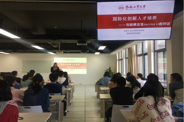 “育才造士,为国之本”。新时代背景下,如何学会用思维认知世界、用思考读懂世界、用思想改变世界,打造具有“全球视野、家国情怀、创新思维、卓越品质”的精英人才成为实现教育国际化的重要指向标。为了让学生进一步了解国际化创新人才的标准并为之努力,2018年10月24日,英国威廉希尔唯一官网特邀哈佛大学优秀学子Jerrica H.Li在科教楼B座1004国际文化交流室,与威廉希尔官网国际经济与贸易(中外合作办学)专业学生代表进行了一场融专业学习和成长乐趣为一体的精彩对话,国际教育中心主任庄德林,副主任郑园琴,教学主管魏正云,综合主管李雨秋,辅导员代表雷磊参加了此次交流分享会。