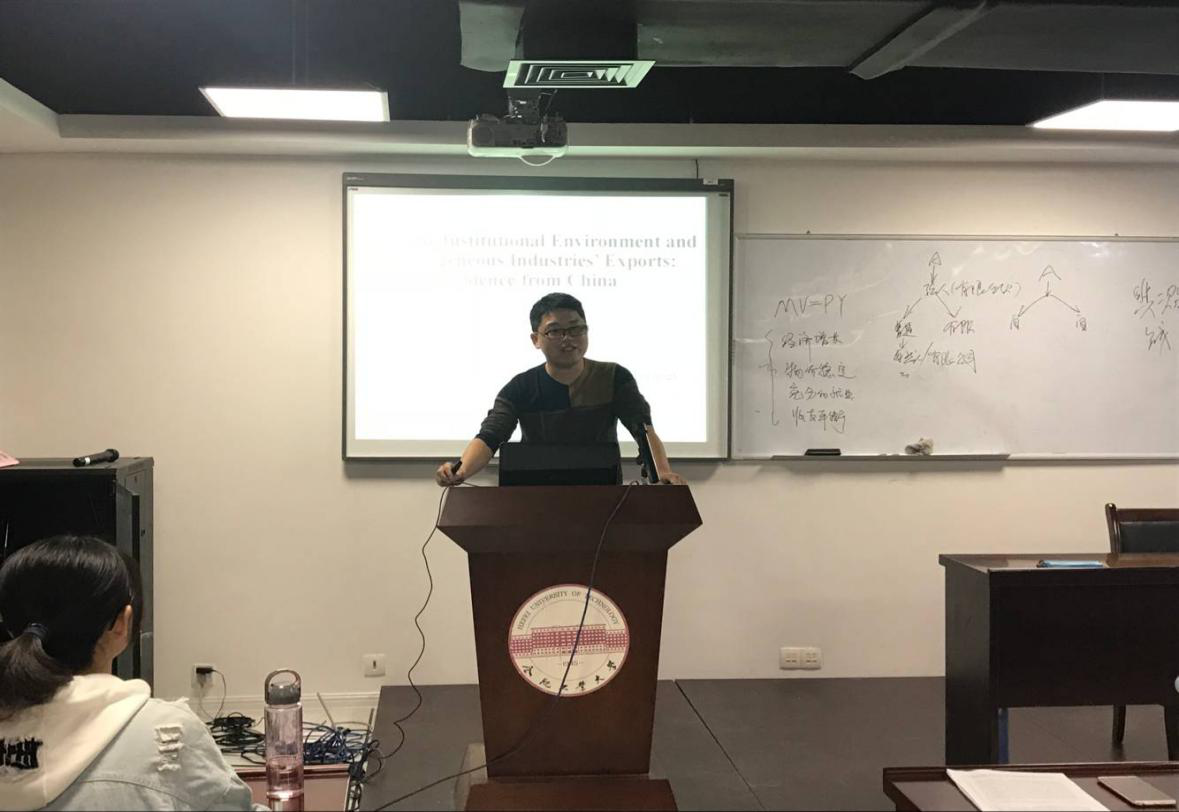 随后吴老师向同学们较详细的分析了一篇他近期将要发表的一篇文章——《Domestic Institutional Environment and Heterogeneous Industries' Exports: Evidence from China》,这篇文章以中国作为新兴经济体的一个典型代表,将其制度环境与进出口制度进行比较,通过建立模型进行实证分析,并结合理论分析,最终得出了“对金融、法律依赖度更高的企业在金融、法律环境更好的地区更有优势”,“制度供给大于需求时行业能更好发展”等结论,文章最后为了验证结论的可靠性,做了稳健型检验。