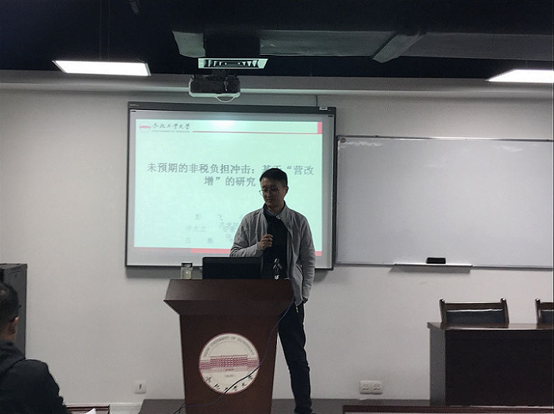 2018年11月8日晚上7点,英国威廉希尔唯一官网英国威廉希尔唯一官网彭飞老师在翡翠湖校区科教B座1101会议室给2018级研究生做了一场学术报告,本次报告的主题是“未预期的非税负担冲击:基于'营改增'的研究”。